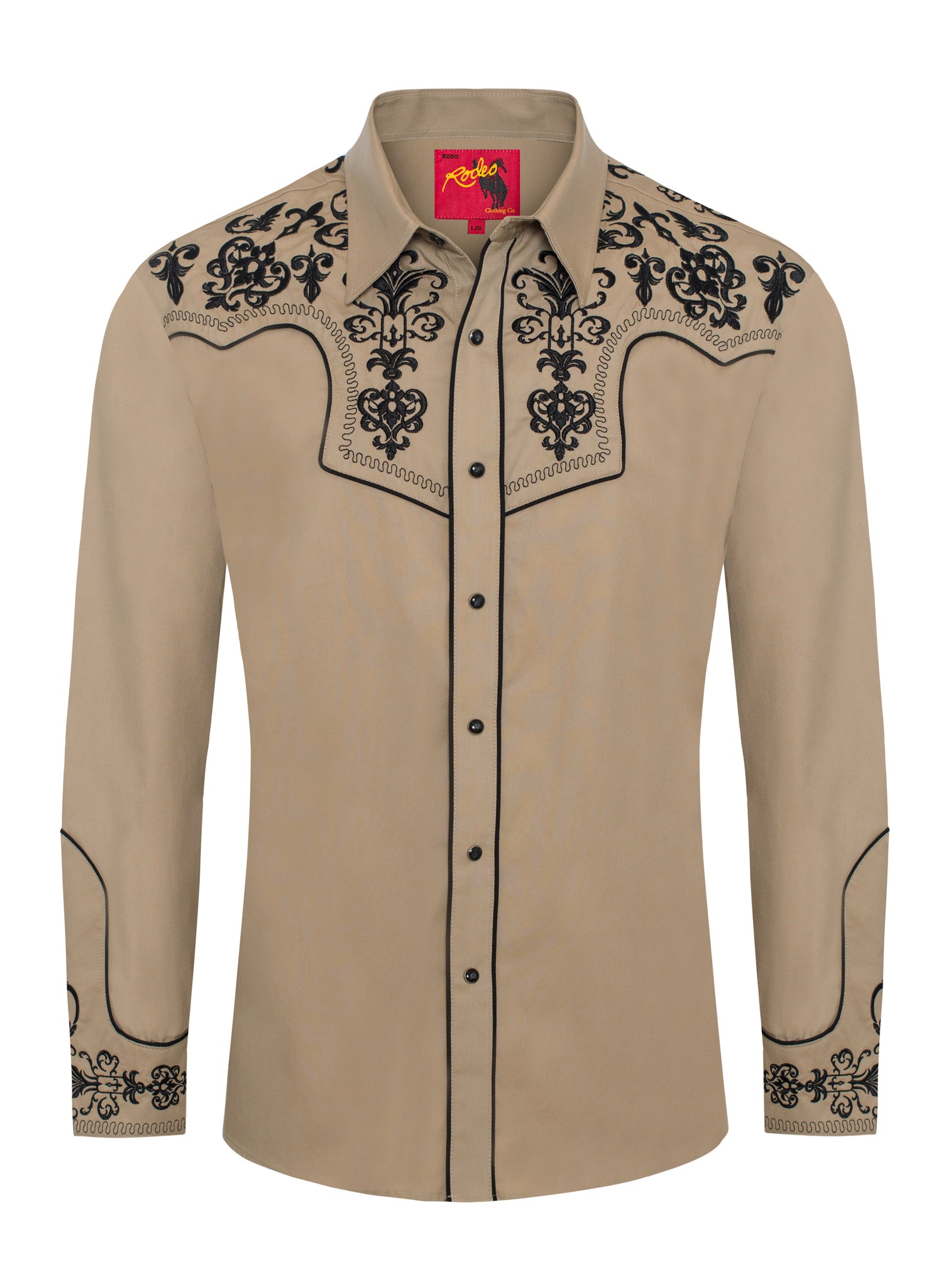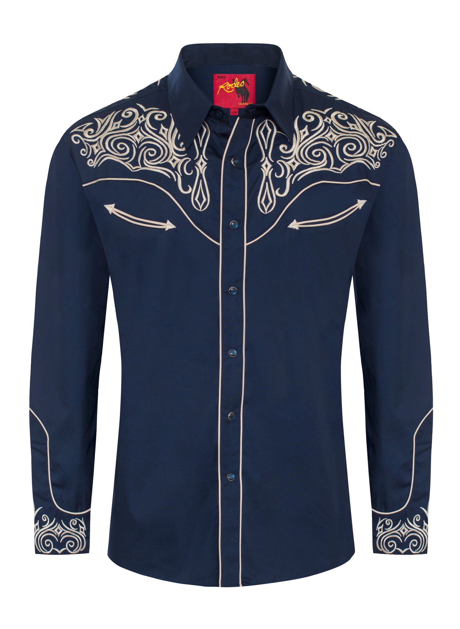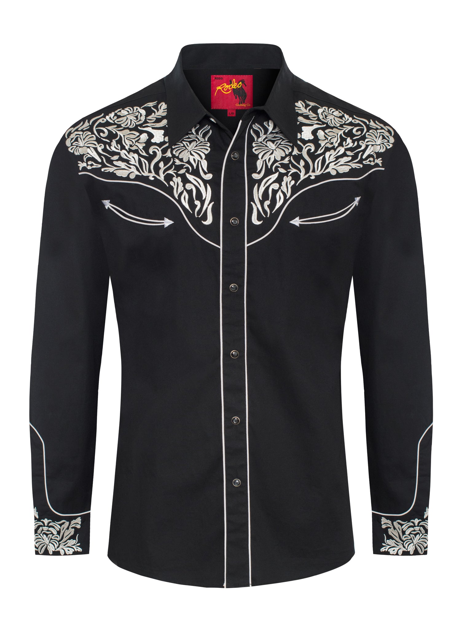 Label: RODEO CLOTHINGDescription: Men's long sleeve cotton/poly western shirts. PATTERN: Solid FABRIC TYPE: Woven COLLAR STYLE: Regular Western Collar...