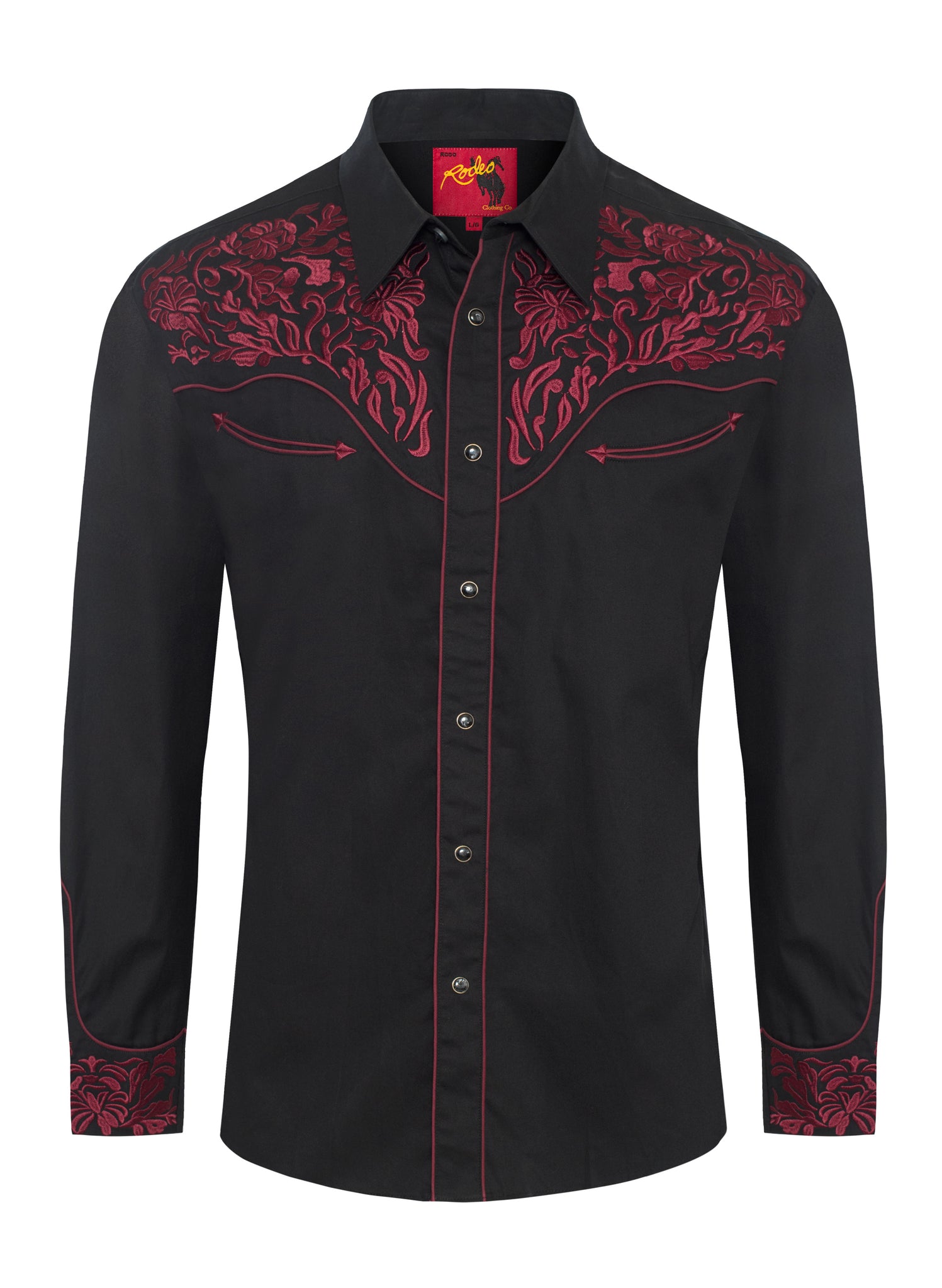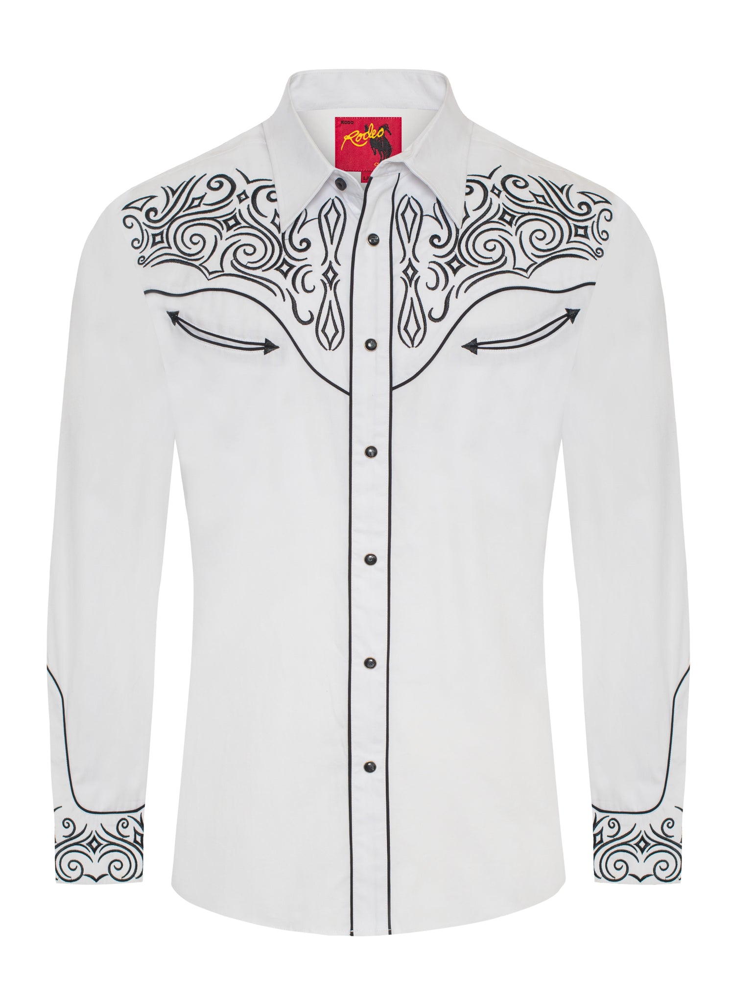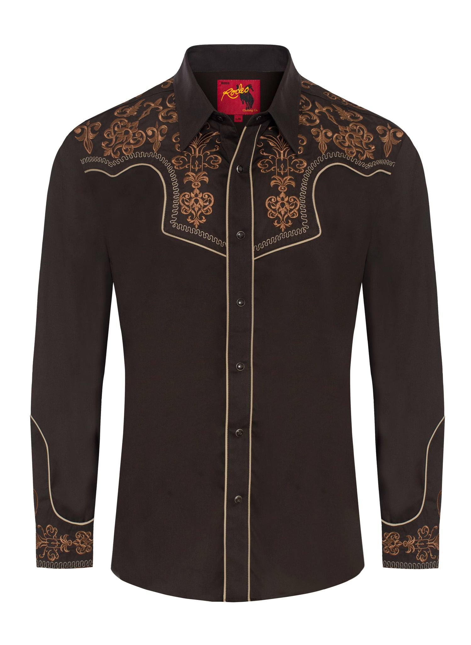 Label: RODEO CLOTHINGDescription: Men's long sleeve cotton/poly western shirts. PATTERN: Solid FABRIC TYPE: Woven COLLAR STYLE: Regular Western Collar...